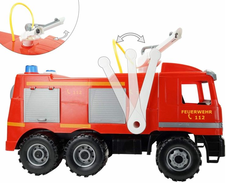 LENA® GIGA TRUCKS Feuerwehr Mercedes Benz Actros mit Aufklebern, 3-Achser, 6 mm verzinkte Stahlachsen. Die Spritze auf dem Dach ist in jede Richtung schwenkbar. Ein seitlich am Fahrzeug angebrachter Hebel treibt die stabile Kolbenpumpe im Inneren des Fahrzeugs auf Höchstleistung. Bis zu 8 Meter weit schießt der Strahl aus dem 1,5 Liter Tank.