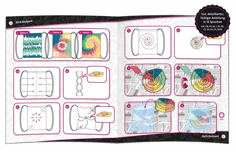 Set mit Leinen-Rucksack, 5 Batikfarben, 3 Textilstiften, verschiedenen Bügelfolien, Haarperlen, Flecht-Haarband mit Perlen und Federn sowie Flecht-Armband mit Metall-Anhänger. Mit ausführlicher, farbiger Anleitung.