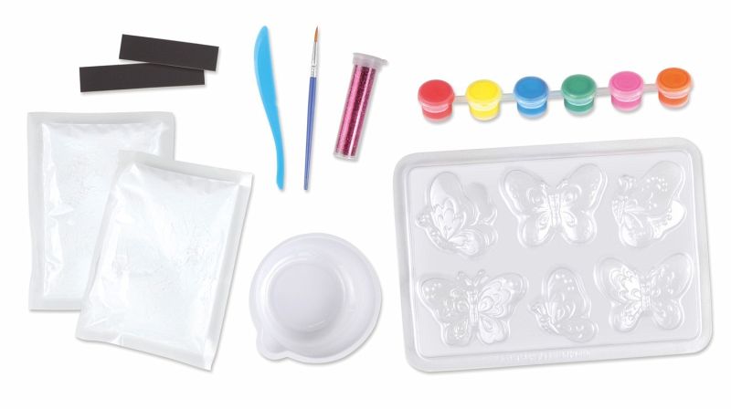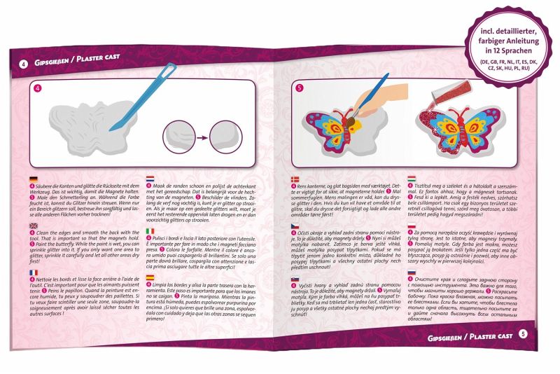 Enthält Gips, Gussform, 6 verschiedene Farben, Glitzer und Magnetstreifen. Inkl. Werkzeug. Mit ausführlicher, farbiger Anleitung.