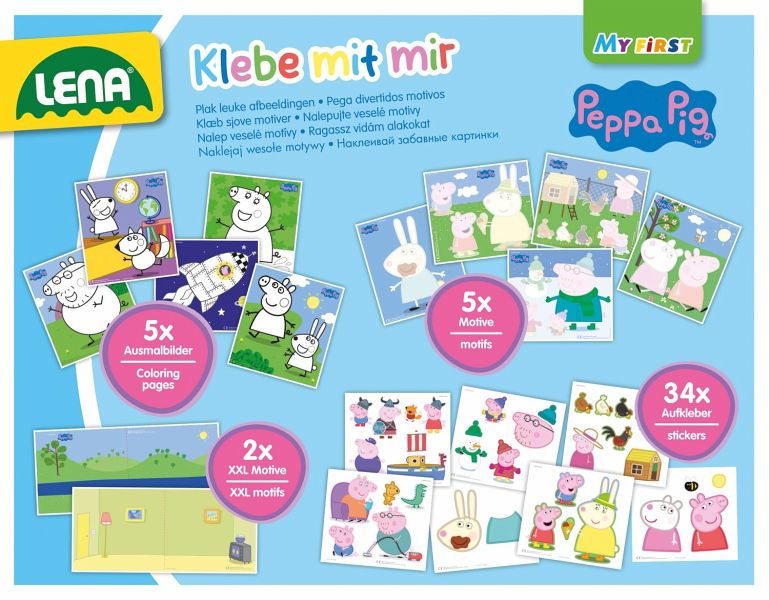 LENA® Klebe mit mir Peppa Pig. Komplettset mit 2 großen Peppa Pig Motiven zum Bekleben mit Stickern + 5 Motive zum Vervollständigen durch Sticker. Inkl. 5 zusätzlicher Motive zum Ausmalen.