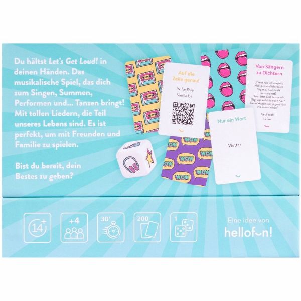 Du hältst "Let's Get Loud!" in deinen Händen. Das musikalische Spiel, das dich zum Singen, Summen, Performen und... Tanzen bringt! Mit tollen Liedern, die Teil unseres Lebens sind. Es ist perfekt, um mit Freunden und Familie zu spielen. Bist du bereit, dein Bestes zu geben?