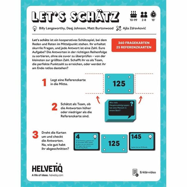 Ihr bekommt skurrile Fragen, deren Antwort immer eine Zahl ist. Eure Aufgabe: Bringt die Antworten in die richtige Reihenfolge - von klein nach groß. Schafft ihr es, als Team die perfekte Punktzahl zu erreichen, oder bleibt ihr am Ende ratlos zurück?1. Legt eine Karte mit einer beliebigen Zahl in die Mitte und zieht dann zufällig 8 Fragekarten, die ihr als Stapel vor euch ablegt.2. Überlegt bei jeder Frage, ob die Antwort höher oder niedriger als die Zahl in der Mitte ist, und sortiert die Fragen entsprechend ein.3. Dreht am Ende alle Fragekarten um und überprüft die Antworten. Wie hoch ist euer Highscore?Ein einfaches Spiel für die Familie und den ganzen Freundeskreis.