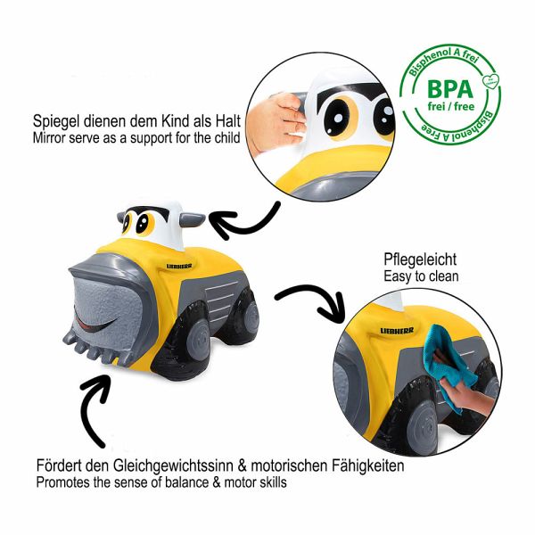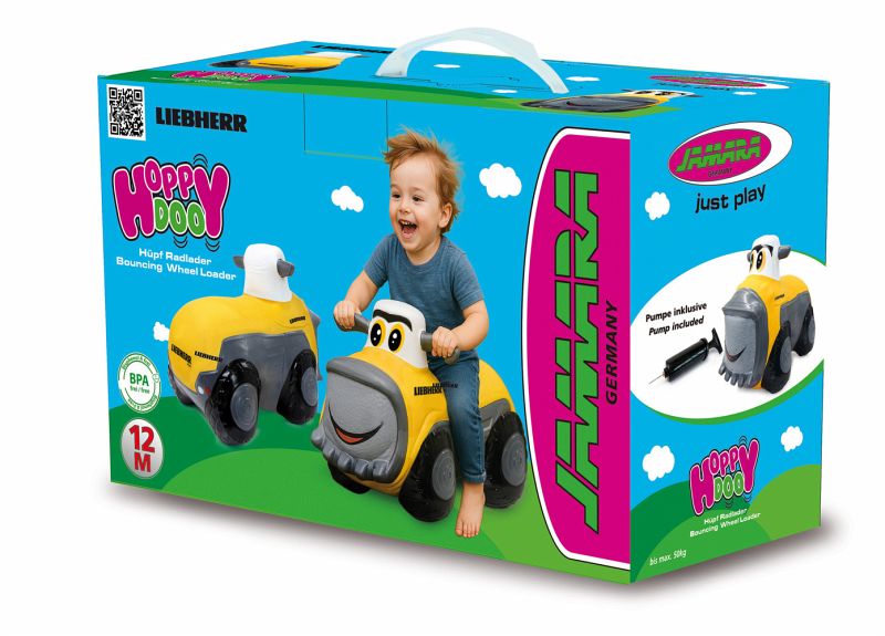 JAMARA hat den Hüpfball als Kinderspielklassiker neu erfunden. Mit tollen, liebevoll gestalteten Motiven kommen die neuen Kinderhüpfspielzeuge auf den Markt. Ein spaßiges Hüpfvergnügen für die Kleinsten versprechen die farbenfrohen Hüpfer von JAMARA. Der kleine gelbe Liebherr-Radlader bringt Spaß und Spielfreude in die heimischen Kinderzimmer. Mit der beiliegenden Luftpumpe ist der kleine Freund kinderleicht in wenigen Minuten in Form zu bringen. Der offiziell lizenzierte Hüpfradlader ist BPA frei, sehr robust, widerstandsfähig und eignet sich für drinnen und draußen. Dieser Bouncer, den es exklusiv nur bei JAMARA gibt, ist so konzipiert, dass er gleichzeitig die motorischen Fähigkeiten fördert und den Gleichgewichtssinn schult. Die Seitenspiegel der Hüpffahrzeuge dienen als Griff zum Festhalten und geben dem Kind einen sicheren Halt auf der Sitzfläche. Also einfach auf den Rücken springen, gut festhalten mit den Beinen am Boden abstoßen und wild los hopsen! Dank der vier großen Räder vom Radlader steht der Hüpfer immer aufrecht und stabil. BPA frei. Mit Luftpumpe. Auf die Baumaschine, fertig, los!