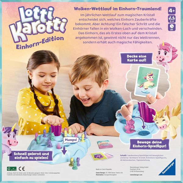 In dieser Ausgabe des Lotti Karotti Spiele-Klassikers laufen 16 niedliche Einhörner in hübschen Pastelltönen um die Wette. Ziel ist der magische Kristall, der oben auf dem Wolkenberg funkelt. Nacheinander decken die Spieler Karten auf, die bestimmen, wie weit die Einhörner entlang dem Wolkenpfad gezogen werden dürfen. Wer die Kristallkarte zieht, darf den Kristall drehen und verändert damit dem Weg. Sicher geglaubte Lauffelder öffnen sich plötzlich und - plumps - fällt das eine oder andere Einhorn hinein. Der einzigartige Spielmechanismus sorgt für anhaltende Spannung von der ersten bis zur letzten Minute.
