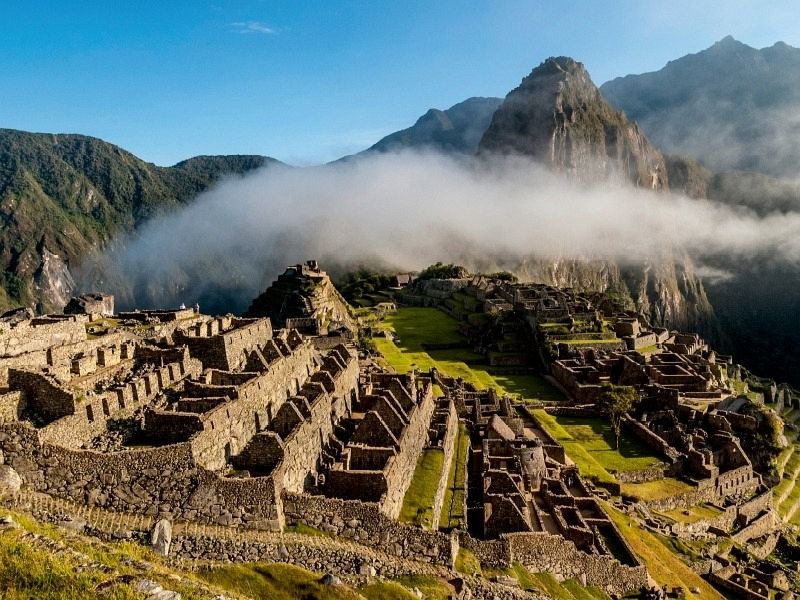 Stimmungsvolles Foto der weltberühmten Inka Festung Machu Picchu mit leichtem Nebel, Peru, Südamerika, UNESCO Weltkulturerbe