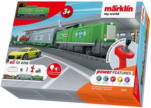 Modell: Lokomotive mit Akkuantrieb und Magnetkupplung am hinteren Fahrzeugende. Motor, Akku und die gesamte Elektronik sind für Kinder unzugänglich verbaut. Die Lok kann mit dem mitgelieferten USB-Ladekabel aufgeladen werden. Jeweils 3 Geschwindigkeitsstufen bei Vorwärts- und Rückwärtsfahrt, sowie 3 Soundfunktionen und ein Dreilicht-Spitzensignal, sind über den kindgerechten Märklin Power Control Stick steuerbar. Schiebewandwagen und Autotransportwagen mit Magnetkupplungen. Der Schiebewandwagen kann geöffnet und mit der mitgelieferten Transportbox, inklusive PKW Räder, beladen werden. Ein fest verbautes Metallteil in der Transportbox ermöglicht die magnetische Verladung, bei der gemeinsamen Nutzung mit der Ergänzungspackung Verladung 44347. Der Autotransportwagen verfügt über eine klappbare Auffahrrampe an einem Wagenende. Inklusive zwei Autos als Beladung. Länge des Zuges 48 cm.Inhalt: 14 gebogene Kunststoffgleise, 12 gerade Kunststoffgleise, 1 Weiche links, 1 Weiche rechts und ein kabelloser, handlicher Märklin Power Control Stick. Ein USB-Ladekabel für die Lokomotive und 2x AAA Batterien sind im Lieferumfang enthalten. Zudem liegt ein Stickerbogen zum Bekleben des Zuges bei. Erweiterbar mit den Kunststoffgleisen aus dem Märklin my world Sortiment.