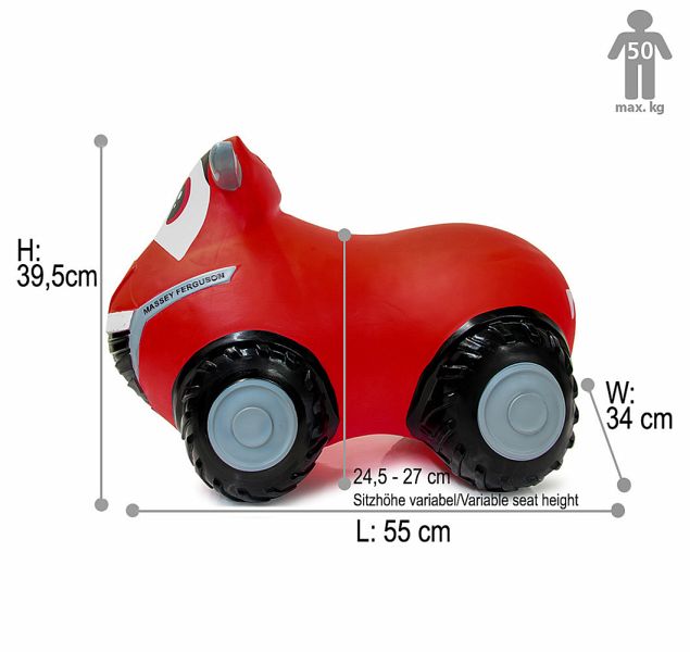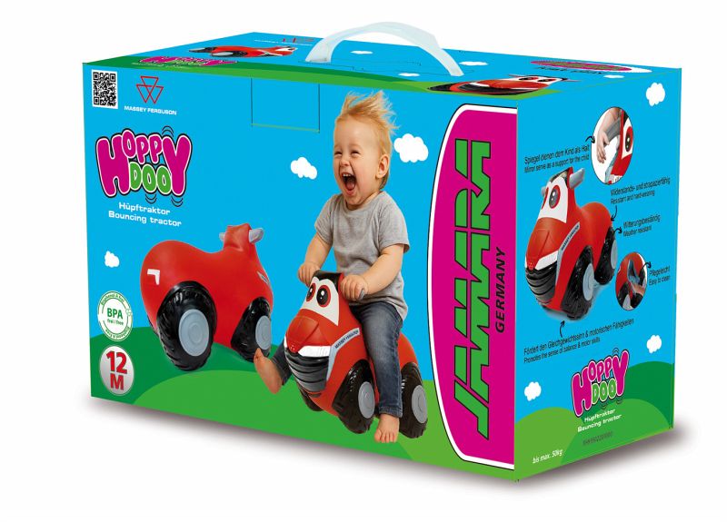Jede Menge Hüpfspaß und gleichzeitig die Förderung des Gleichgewichtssinns sowie der motorischen Fähigkeiten bieten die pflegeleichten Hüpfspielzeuge von JAMARA, die mit der beiliegenden Luftpumpe kinderleicht in Form zu bringen sind. Eine Besonderheit unter den Hüpfern ist der JAMARA Hüpftraktor von Massey Ferguson. Hier findet ein liebevoll gestalteter, offiziell lizensierter Hüpftraktor den Weg in die Kinderzimmer. Die Außenspiegel des Hüpftraktors dient zum festhalten und geben dem Kind einen sicheren Halt auf dem Modell. Belastbar bis 50 Kilo, ist das der Hüpftraktor aus robustem, widerstandsfähigen, BPA-freiem Material gefertigt.
