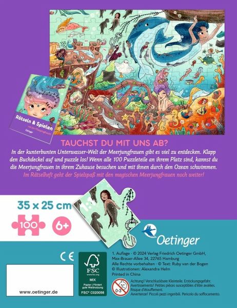 Stück für Stück lässt sich aus 100 Puzzleteilen ein wimmeliges Bild aus der faszinierenden Unterwasserwelt im Format 35 x 25 cm erschaffen. Das Meerjungfrauen-Puzzle befindet sich in einer stabilen Buchverpackung und enthält 100 Puzzleteile und ein Begleitheft voller Rätsel und Spiele.