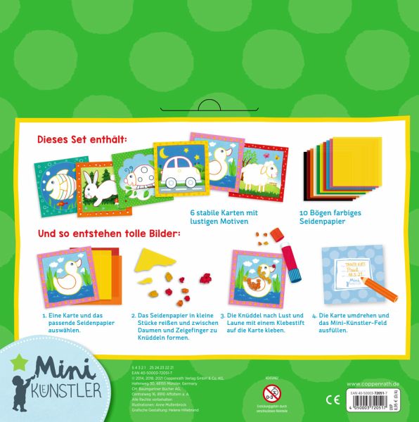 Alles-drin-Set: 6 Motivkarten und 10 Bögen farbiges Seidenpapier. Knüddelbilder zu erstellen ist eine beliebte Basteltechnik in Spielgruppen und Kindergärten.So geht's:1. Eine Motivkarte und das passende Seidenpapier auswählen.2. Das Seidenpapier in kleine Stücke reißen und zwischen Daumen und Zeigefinger zu Knüddeln formen.3. Die Knüddel mit einem Klebestift (nicht im Set enthalten) auf die Motivkarte kleben.