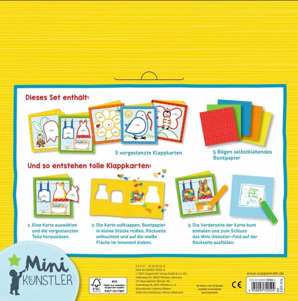 Alles-schon-drin-Set mit 5 Klappkarten und selbstklebendem Buntpapier. Und so entstehen tolle Bilder:1. Eine Karte auswählen und die vorgestanzten Teile herauslösen.2. Die Karte aufklappen, Buntpapier in kleine Stücke reißen, Rückseite anfeuchten und auf die weiße Fläche im Innenteil der Karte kleben.3. Die Vorderseite der Karte bunt anmalen und das Mini-Künstler-Feld auf der Rückseite ausfüllen.