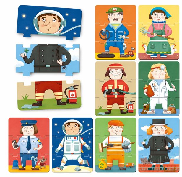Die dreiteiligen Puzzle-Berufe können beliebig untereinander getauscht werden. Mit extragroßen Teilen für kleine Hände erfinden Puzzle-Fans hier ihre ganz eigenen verrückten Fantasie-Berufe.