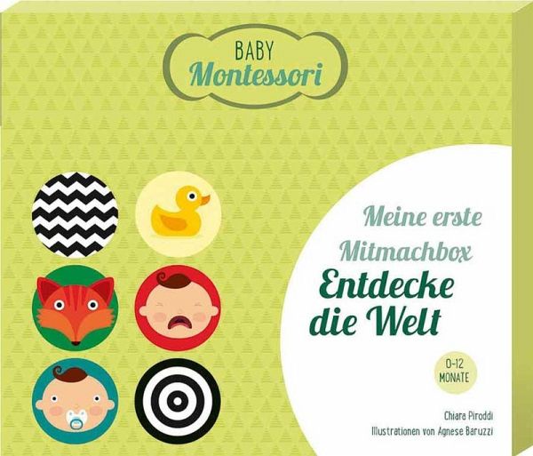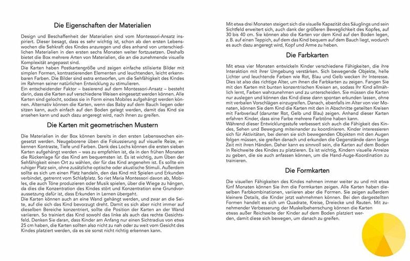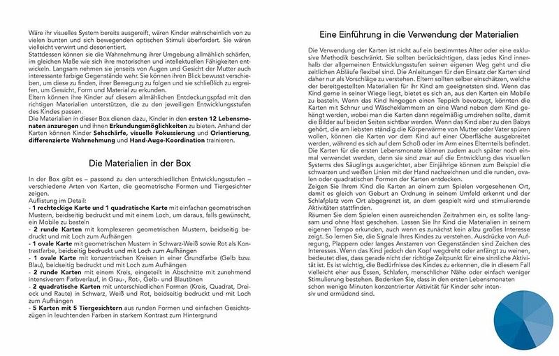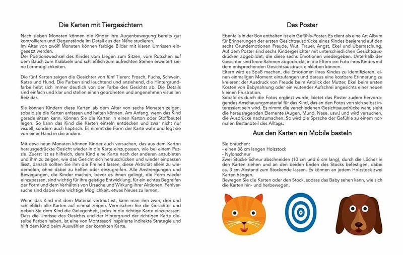 Jetzt geht Ihr Baby auf Entwicklungsreise! Nach individuellem Bedarf lassen sich die farbenfrohen Montessori-Karten als Mobile oder als Babypuzzle verwenden. Sie stimulieren die Sehkraft des Neugeborenen, ab vier Monaten seine Farbunterscheidung und spornen schließlich dazu an, sie zu ergreifen und zu berühren. Halten Sie die schönsten Momente des Entdeckens auf dem extra Poster fest.