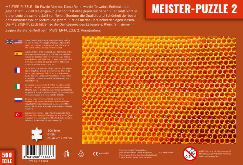 MEISTER-PUZZLE - für Puzzle-Meister. Diese Reihe wurde für wahre Enthusiasten geschaffen. Für all diejenigen, die schon fast alles gepuzzelt haben. Hier zählt nicht in erster Linie die schiere Zahl von Teilen. Sondern die Qualität und Schönheit der besonders anspruchsvollen Motive, die jedem Puzzle-Fan das Herz höher schlagen lassen. Die MEISTER-PUZZLE bilden so die Quintessenz des Legespiels: Klein, fein, gemein. Zeigen Sie Bienenfließ beim MEISTER-PUZZLE 2: Honigwaben.