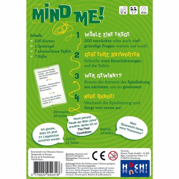 Wie viele Liegeschützen schaffe ich wohl? An welchen Song denkst du zuerst bei 80er-Jahre-Musik? Und wer aus unserer Runde würde eine Zombie-Apokalypse am besten überstehen? Bei Mind me müsst ihr die Antworten der anderen einschätzen und so möglichst viele Punkte sammeln. Die Fragen sind manchmal tiefgründig, manchmal total verrückt und manchmal bieten sie spannende Challenges! Wer kennt wen von euch am besten? Findet es heraus!