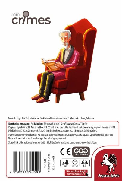 Die MiniCrimes-Fälle sind kooperative Krimispiele, in denen die Spielenden ihre Beobachtungsgabe und ihre detektivischen Fähigkeiten unter Beweis stellen müssen, um einen mysteriösen Fall zu lösen. Sie untersuchen dabei den Tatort und bis zu 10 Hinweise, die sie mit Bedacht auswählen müssen, um das Geheimnis zu lüften! In MiniCrimes - Stille Nacht wird ein reicher Mann namens Sir Cartwright von seinem Butler in seinem Wohnzimmer mit einer Kugel im Kopf gefunden - ein klassischer Selbstmord am Heiligabend oder vielleicht doch nicht?