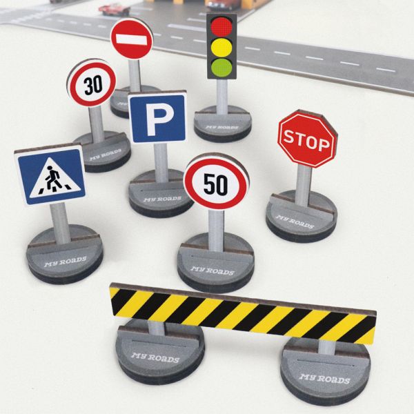 Auf den Straßen ist viel los, was kann da helfen? Die MyRoads-Traffic Signs! Diese acht internationalen Verkehrsschilder aus Holzwerkstoff bringen Ordnung in den Straßenverkehr im Kinderzimmer. Die realistisch gestalteten Schilder sind einfach zusammen zu stecken, besitzen einen stabilen Sockel und verfügen über die bewährte Werkhaus-Qualität. Sie verleihen dem Spiel mehr Authentizität und vermitteln nebenbei Wissen über wichtige Verkehrsregeln im Sinne einer frühen Verkehrserziehung. Die ideale Ergänzung für alle Starter, Zusatz- und Erweiterungssets von MyRoads! Das ideale Mitbringsel für alle kleinen MyRoads- und Straßenspiel-Fans.