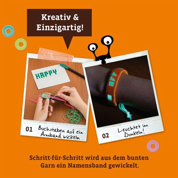 Mit der AllesKönnerKiste „Namensbänder wickeln“ entwerfen Kinder ab 8 Jahren ganz individuelle Armbänder in lässigen Designs- Angesagt: viele bunte Garne und ein nachleuchtender Garn sorgen für einen besonderen Effekt