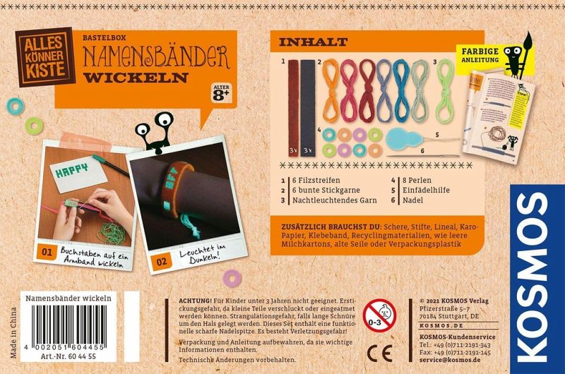 Mit dieser AllesKönnerKiste zaubern Kinder ab 8 Jahren lustige Botschaften, Muster und die Namen ihrer Freunde auf bunte Armbänder.Die Anleitung erklärt ausführlich die besondere Wickeltechnik und liefert viele Beispiele für das individuelle Accessoire. Dafür die gewünschten Baumwollgarne und Perlen in den Lieblingsfarben auswählen und losbasteln.