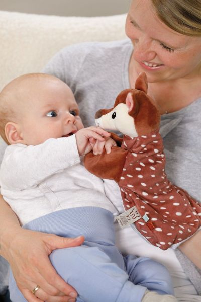 Das supersüße, braun-weiße Schmusetuch ist nicht nur flauschig weich und kuschelig, sondern auch der perfekte Begleiter für die ersten Lebensjahre. Aus hochwertigem NICI Plüsch gefertigt, lädt das Rehkitz Schmusetuch zum Nuckeln, Greifen, Kuscheln und Spielen ein. Der Materialmix aus glattem und geripptem Plüsch macht das Schmusetuch zu einem unverzichtbaren haptischen Erlebnis. Doch damit nicht genug! Im Handumdrehen verwandelt sich das Rehkitz Schmusetuch in eine niedliche Handpuppe. Ein lustiger Pilz, der als 2D-Plüschelement an der Hand der Handpuppe befestigt ist, sorgt für noch mehr Spaß und weckt die Aufmerksamkeit des Babys. Das My First Nici 2in1 Rehkitz Schmusetuch und Handpuppe ist ein treuer Begleiter und schafft Erinnerungen, die ein Leben lang halten!