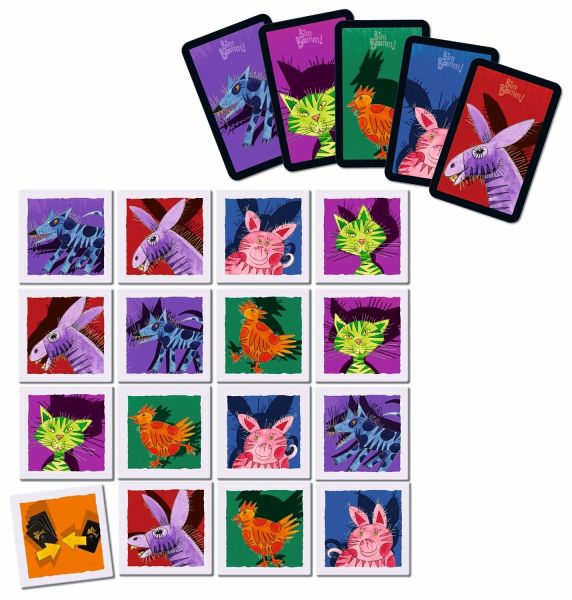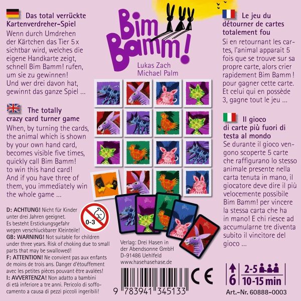 Das total verrückte Kartenverdreher-Spiel Wenn durch Umdrehen der Kärtchen das Tier 5x sichtbar wird, welches die eigene Handkarte zeigt, schnell Bim Bamm! rufen, um sie zu gewinnen! Und wer drei davon hat, gewinnt das ganze Spiel.