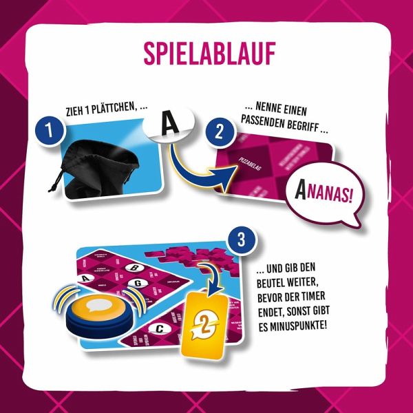 Pizzabelag, Karnevalskostüm oder Superhelden. In Gridlook liegt eine Vielzahl unterschiedlicher Kategorien aus. Wer am Zug ist, ermittelt einen Buchstaben, sucht sich eine beliebige Kategorie aus und nennt einen passenden Begriff. Die Kategorie wird abgedeckt und der Zug an die nächste Person übergeben. Doch Vorsicht! Vor jeder Runde wird ein Zufalls-Timer gestellt, der jederzeit ablaufen kann. Derjenige, der am Zug ist, wenn der Timer ertönt, erhält einen Strafchip. Das Spiel endet, wenn alle Kategorien abgedeckt sind. Das ultimative Partyspiel für zwei bis acht Spielerinnen und Spieler ab 10 Jahren - schneller und turbulenter Spielspaß für Freunde und Familien garantiert!