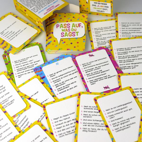 Rennst du gern durch den Regen? Kannst du bis zehn zählen?Auf diese Fragen nicht mit »Ja«, »Nein« oder »Vielleicht« zu antworten, ist ganz einfach? Fehlanzeige! Nur wenn du einfallsreich und geschickt genug bist, kannst du hier gewinnen.Von Pass auf, was du sagst - Die Kinderedition gibt es jetzt endlich Teil 2 mit über 300 neuen Fragen für Kinder ab 6 Jahren. Auch hier gilt: Alle Fragen einer Karte musst du wohlüberlegt und geschickt beantworten. Nur wenn du das schaffst, kannst du punkten und das Spiel für dich entscheiden. Ob in der großen Pause, bei Kindergeburtstagen oder langen Autofahrten - hier hast du garantiert jede Menge Spaß!
