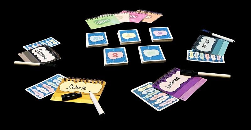 Man stelle sich vor: jeder Spieler hat nur ein einziges Wort, um einen geheimen Begriff zu umschreiben. Klingt einfach? Denkste! Denn auf der Aufgaben-Karte stehen gleich sechs mögliche Wörter, und nur eines davon ist das gesuchte. Welches es ist, verrät eine Zahlenkarte. Nun beginnt der wilde Ritt. Der erste Spieler gibt ein Wort als Hinweis, der nächste muss daraus ein neues Wort ableiten, und so wandert die Assoziationskette weiter – in Form von kleinen Ringbüchlein, die mit Spielernamen (zum Nachvollziehen) und eben einer Assoziation versehen werden. Am Ende muss geraten werden, welches der sechs Wörter ursprünglich gemeint war.