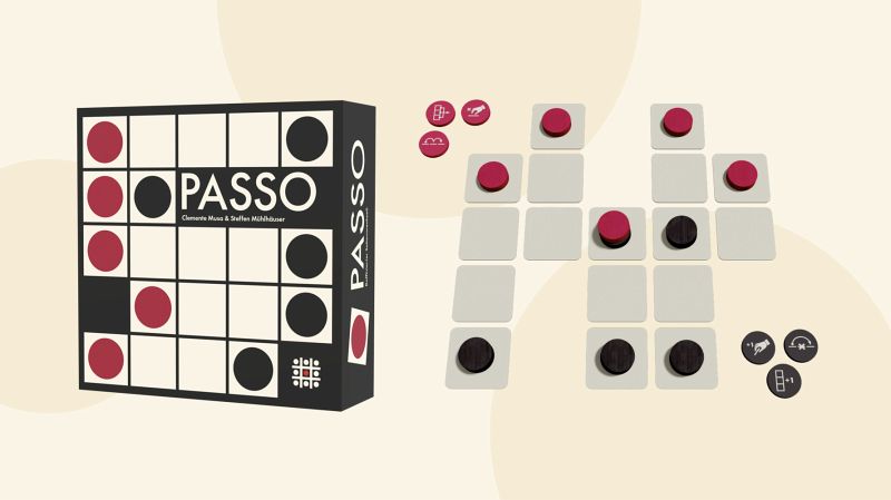 Die Regeln von Passo könnten nicht simpler sein!Bewegt eure Scheibe auf ein neues Plättchen und entfernt das alte Plättchen. Versucht euch nicht von eurem Gegenüber blockieren zu lassen und passt auf, dass eure Scheiben nicht isoliert werden, während der Spielplan immer kleiner wird!Wer zuerst die gegnerische Seite des Spielfelds erreicht gewinnt!