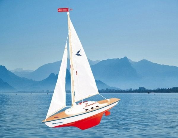 Segelboot STURMVOGEL. Segeljacht mit einstellbaren und reffbaren Segeln, Ruderblatt einstellbar, lackiertes Holzdeck. Kentersicher u nd seetüchtig. Mit Unterwasser-Speziallackierung. Segelfertig montiert. Mit ausführlicher Segelanleitung. Größe: 55 x 67 cm. Made in Germany!