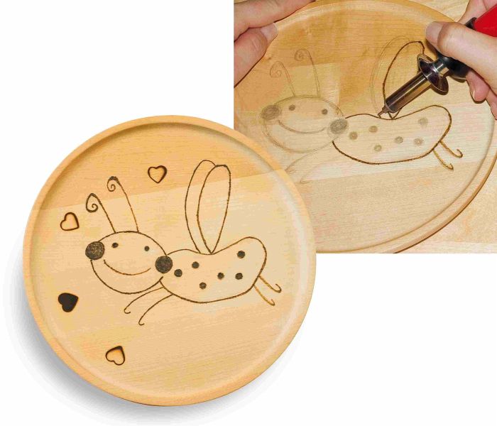 ANWENDUNG: Individuelle Vorlage mit einem Bleistift vormalen. Linien mit dem Brandmalkolben nachzeichnen oder einen der vielen Brennstempel verwenden.