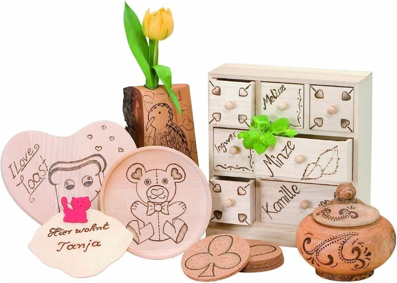 Mit unserer Profi Brandmal-Station entstehen die schönsten Kunstwerke auf Holz, Leder oder Kork. Die Motive werden in das Material eingebrannt. Durch unsere große Auswahl an verschiedenen Aufsätzen wie Brennspitzen, Brennschleifen und Brennstempeln können viele Motive eingebrannt werden. Die Brandmalerei ist somit für Erwachsene und Kinder gleichermaßen geeignet.