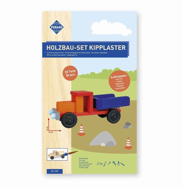 Nach dem Zusammenbau kann der Kipplaster nach Wunsch bemalt werden. Ausführliche Anleitung enthalten.