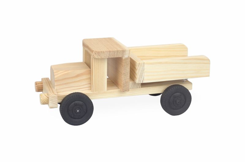 Inhalt: 6 Kiefernleisten, 1 Sperrholz, 1 Achse Ø 3 x 70 mm, 2 x Achsen Ø 3 x 100 mm, 6 x Distanzscheiben, 4 x Räder Ø 45 x 10 mm, 2 x Holzscheiben Ø 15 x 10 mm, 8 x Ringschrauben 10 mm. Nach dem Zusammenbau kann der Kipplaster nach Wunsch bemalt werden.