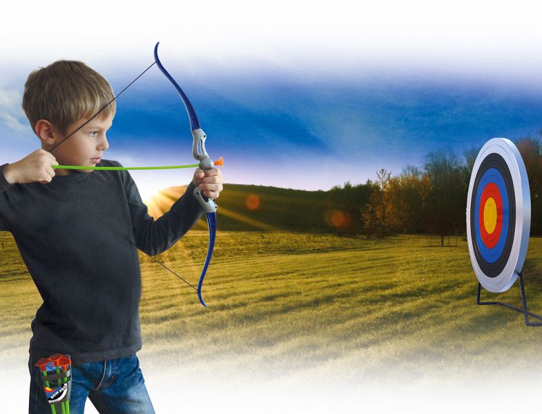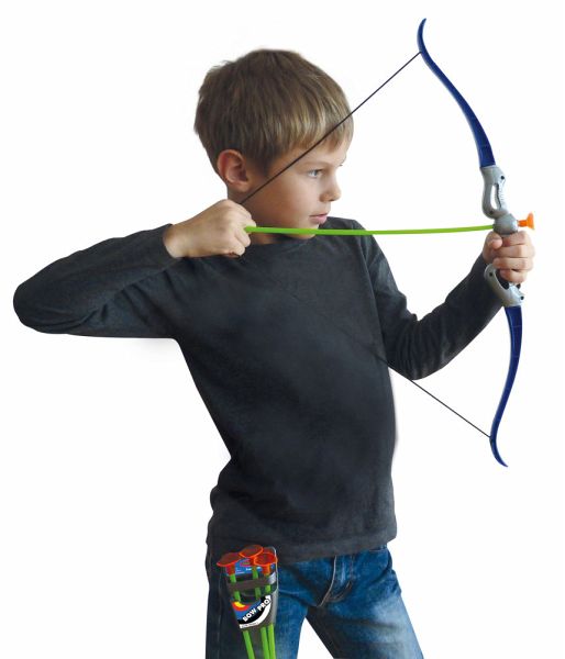 Cowboy und Indianer! mit Jamaras Pfeil- und Bogen Set. Im dazugehörigen Köcher, der an der Kleidung mit einem Haken befestigt werden kann, lassen sich die Pfeile verstauen. Pfeil aus dem Köcher ziehen, Bogen spannen und Schuss frei. Zum Set gehören 4 Pfeile mit Saugnäpfen, die auf relativ glatten Flächen haften bleiben.