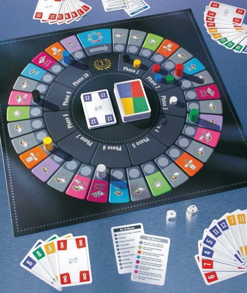 Natürlich geht es auch dieses Mal darum vorgegebene Phasen, zB 4 Zwillinge oder 1 Achterfolge, möglichst schnell auszulegen, allerdings nicht ohne Besonderheit. Das Spielbrett zeigt einen Kreislauf, auf dessen äußerem Rand die Spielfiguren gezogen werden, innen befindet sich der Phasenring, der anzeigt, welcher Spieler sich in welcher Phase befindet. Bevor überhaupt eine Karte gezogen oder gar ausgelegt wird, steht immer das Würfeln an. Mit seiner Spielfigur landet der jeweilige Spieler entsprechend auf einem der Aktionsfelder, welches ihm anzeigt wie nun weiter vorgegangen wird. So kann es vorkommen, dass man bis zu vier (unerwünschte) Karten ablegen darf, um dafür bis zu fünf neue zu ziehen. Auch Joker, die in dieser Spielvariante nicht innerhalb der Karten vorhanden sind, kann man, wenn das Glück mitspielt, erhalten. Sieben verschiedene solcher Aktionen sind vorhanden, die mal mehr mal weniger vorteilhaft sind.
