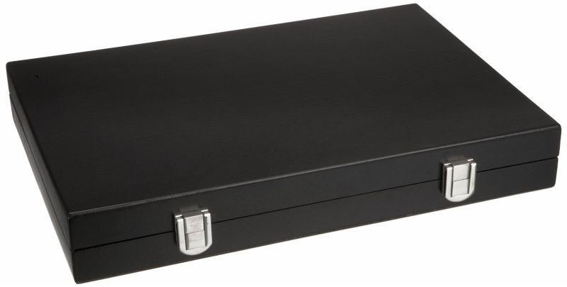 Kassette: Maße 380 x 235 x 55 mm, Erle, schwarz lackiert, Intarsien, Steinablage, mit Spielsteinen und Würfel. Anzahl Spieler: 2, Altersempfehlung: ab 6 Jahren, Spieldauer: ca. 10 Minuten, Spielanleitung: Sprache DE, GB, FR, ES
