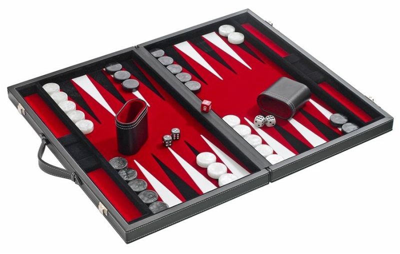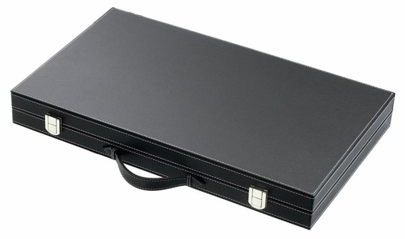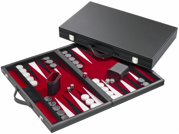 Kunstleder schwarz, Filzinlett rot, eingelegte Zungen schwarz/weiß, Steinablage, Spielsteine schwarz/weiß mit Pearleffekt, Würfel mit Pearleffekt und Würfelbecher.