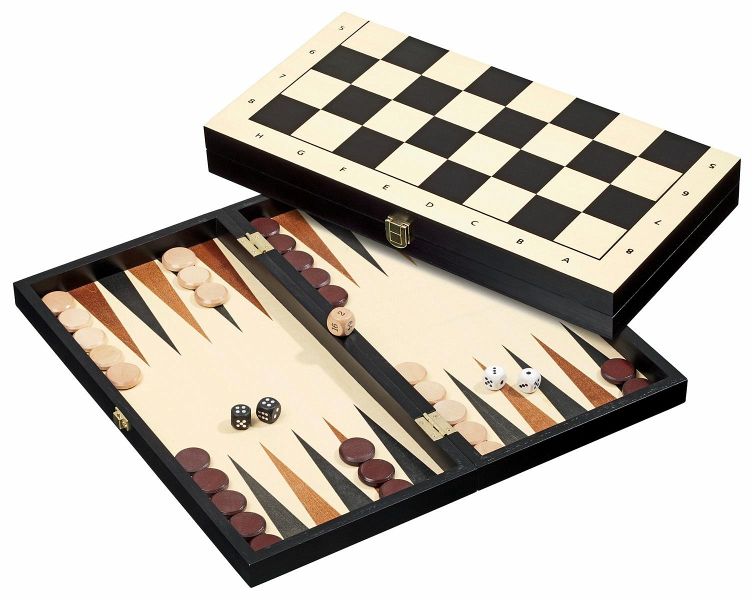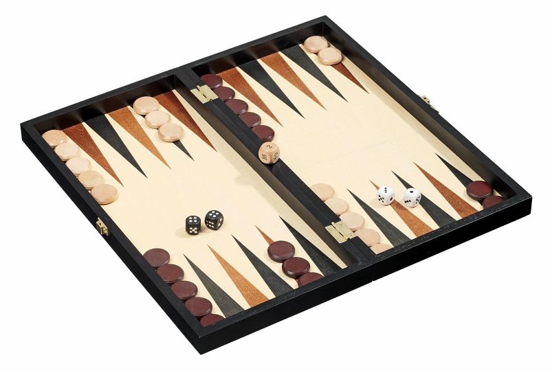 Innen: Backgammon, bedruckt, mit Spielsteinen und Würfel.