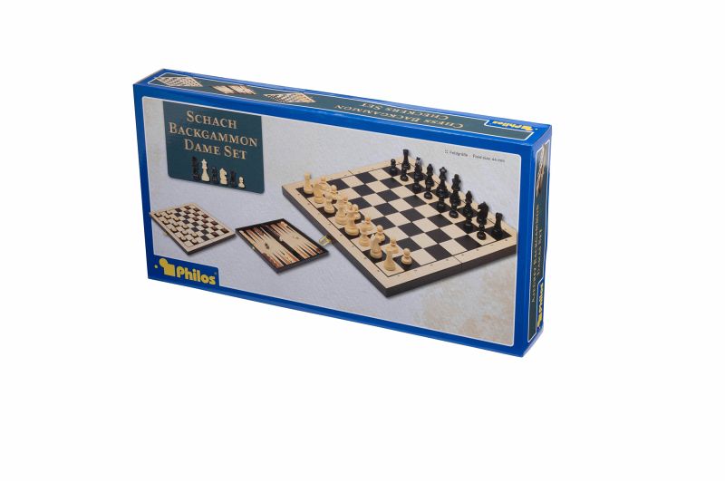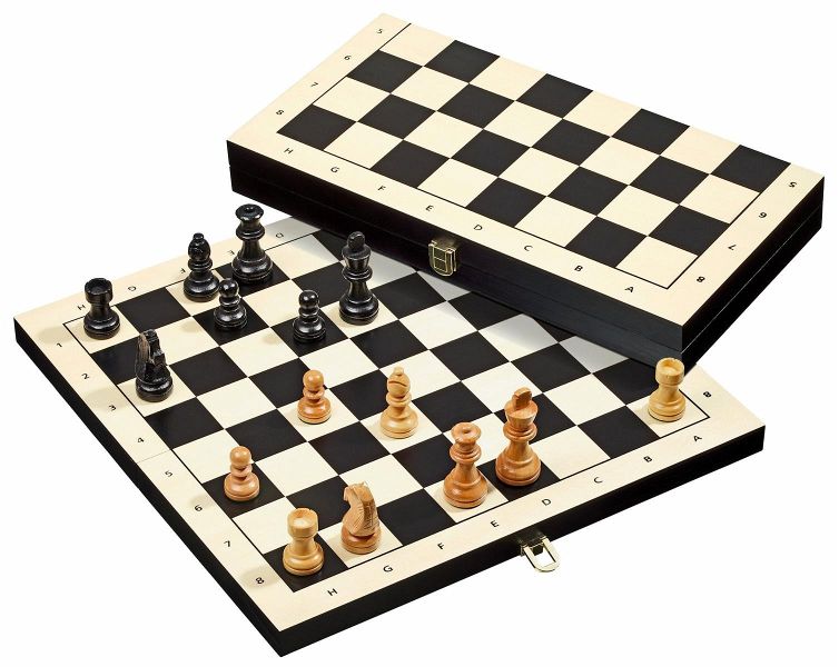 Kassette: Samak-Holz, Maße 410 x 204 x 50 mm, Außen: Schach und Dame, Feld 44 mm, bedruckt.