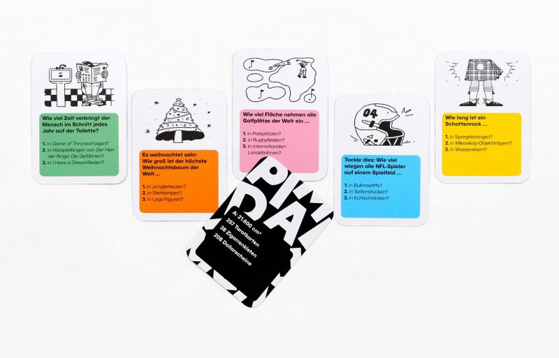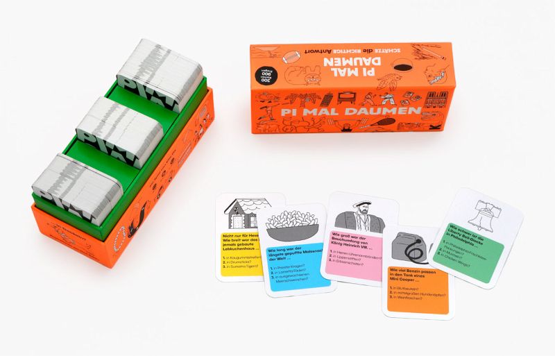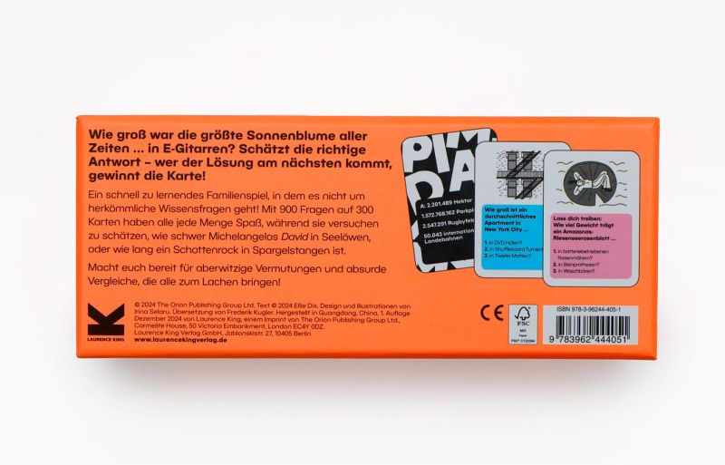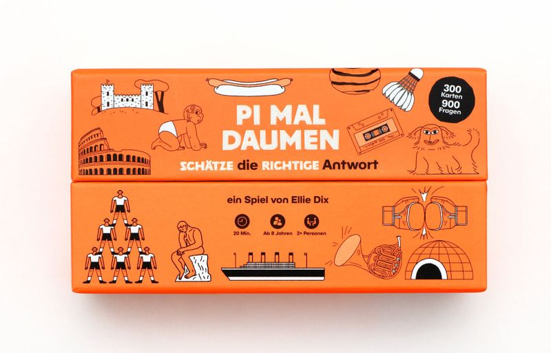 -Ein Schätzspiel für unendlichen Spaß-Kein Wissensspiel im eigentlichen Sinn, aber man lernt eine Menge!-Vergnügliche Fragen und aberwitzige Vergleiche, die jede_n zum Lachen bringen, während man versucht, die Antwort zu schätzenWie groß war die größte Sonnenblume aller Zeiten ... in E-Gitarren? Die richtige Antwort muss geschätzt werden und wer der Lösung am nächsten kommt, gewinnt die Karte!Pi mal Daumen ist ein schnell zu lernendes Familienspiel, in dem es nicht um herkömmliche Wissensfragen geht. Mit 900 Fragen auf 300 Karten haben alle jede Menge Spaß, während sie versuchen zu schätzen, wie schwer Michelangelos David in Seelöwen, oder wie lang ein Schottenrock in Spargelstangen ist.Machen Sie sich bereit für aberwitzige Vermutungen und absurde Vergleiche, die alle zum Lachen bringen!