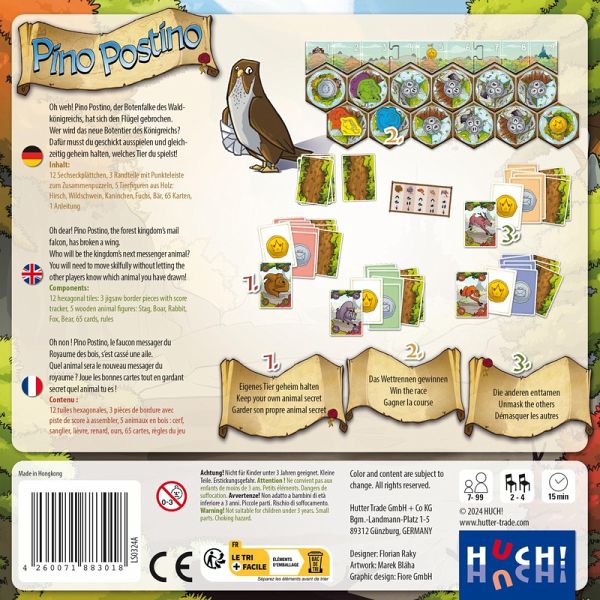 Oh weh! Pino Postino, der Botenfalke des Waldkönigreichs, hat sich den Flügel gebrochen. Wer sich schnell und unauffällig durch das Land bewegen kann, ist hier genau das richtige Tier. Und so begeben sich Hirsch, Wildschwein, Kaninchen, Fuchs und Bär in den Wettstreit: Wer wird diese wichtige Aufgabe übernehmen dürfen, bis Pino wieder gesund ist? Zu Beginn erhalten alle eine geheime Tier-Identität. Die fünf Tierboten werden auf ihrem Weg durch die verschiedenen Landschaften des Landes mittels Karten von euch bewegt. Wer ist fl ink und vorausschauend? Wem gelingt es, die Identitäten der anderen zu enttarnen und dafür Zusatzpunkte zu gewinnen?