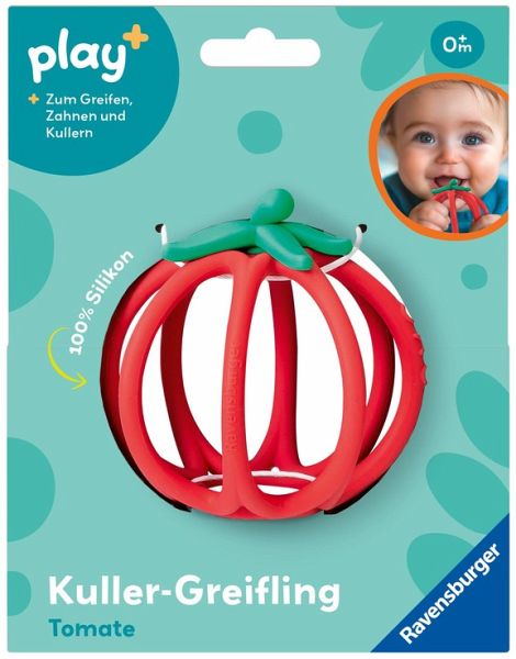 Kullernder Greifling zum Beißen und Spielen ? zu 100% aus Silikon! Die weiche Frucht lädt zum Greifen ein, die härteren Blätter zum Kauen, wenn die ersten Zähne kommen. Play+, die neue Baby- und Kleinkindlinie, fokussiert auf eine ganzheitliche frühkindliche Förderung mit der gesamten Erfahrung der Marke Ravensburger. Die abwechslungsreichen Bücher und Spielzeuge von Play+ garantieren Kindern von 0-3 Jahren jede Menge Spaß und ermöglichen ein spielerisches Lernen und Entdecken egal ob gemeinsam oder auch allein. Die Bedürfnisse der Kinder und die Anforderungen der Eltern bestimmen die Entwicklung aller Produkte. Der Blick fürs Detail, das besondere Extra und eine moderne Gestaltung machen das Programm von Play+ aus, immer unter Einhaltung der hohen Ravensburger Sicherheits- und Qualitätsansprüche. Denn sicher ist sicher.