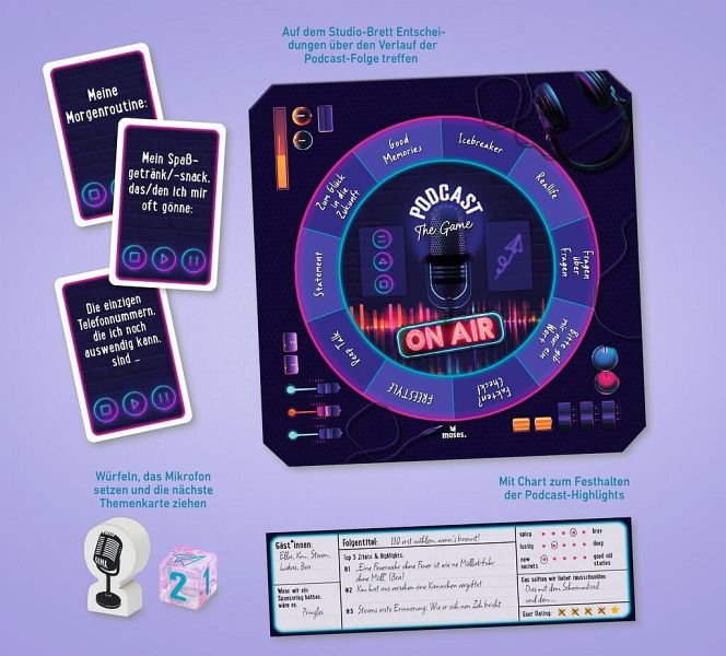 nur zuzuhören, wird man selbst Teil einer kleinen Podcast-Show – spontan, unterhaltsam und voller…mehrDas kreative Kommunikationsspiel moses. Podcast – The Game aus dem Moses Verlag bringt frischen Wind an den Spieletisch. In einer Zeit, in der Podcasts zu den beliebtesten Medienformaten gehören, greift das Spiel diesen Trend auf und macht ihn für Freundesrunden und Familienabende erlebbar. Anstatt nur zuzuhören, wird man selbst Teil einer kleinen Podcast-Show – spontan, unterhaltsam und voller überraschender Gespräche.