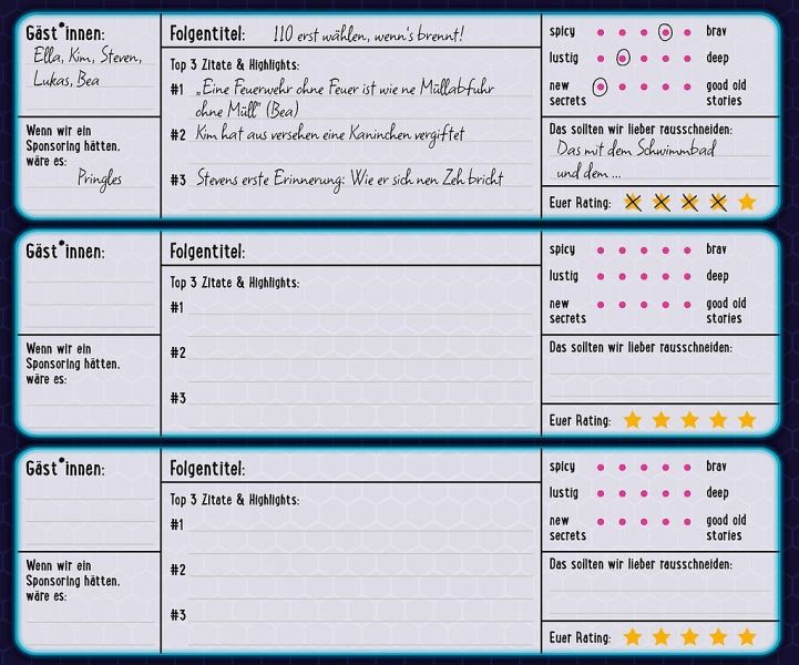 Ein besonderes Highlight ist das beiliegende Highlight-Sheet. Hier können die Spielerinnen und Spieler die schönsten und lustigsten Momente der Runde festhalten: von originellen Folgentiteln über Lieblingszitate bis hin zu Bewertungen wie „spicy“ oder „brav“. Dadurch bleibt der Abend nicht nur in Erinnerung, sondern wird auch schriftlich festgehalten – fast wie eine kleine Podcast-Historie.