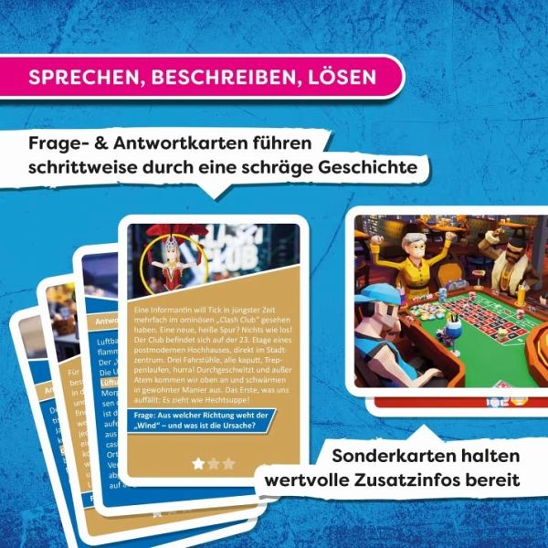 Auf der Jagd nach einem flüchtigen Straftäter ermittelt das Team im sagenumwobenen Clash Club. Techno meets Wellness meets Spielcasino meets Einrichtungshaus. Doch die Jagd verläuft gänzlich anders als geplant Jede Person erhält einen Faltplan mit eigenem Blickwinkel aber niemand hat den kompletten Überblick! Kann das Team die Rätsel des Clash Clubs gemeinsam lösen? Ein genial einfaches Spielprinzip mit hoher Spieltiefe und innovativem "Ich sehe was, was du nicht siehst"-Mechanismus.