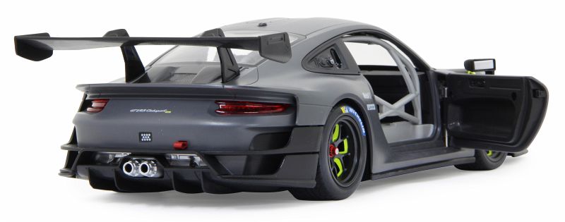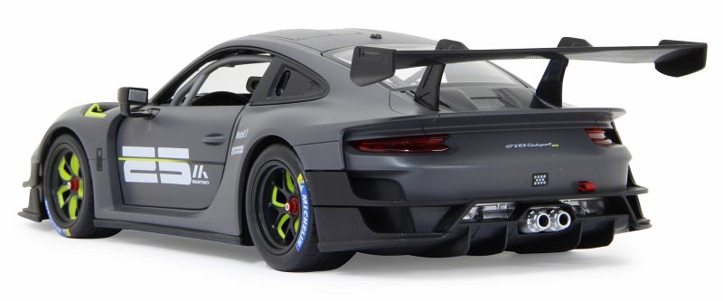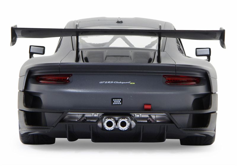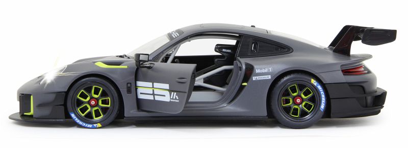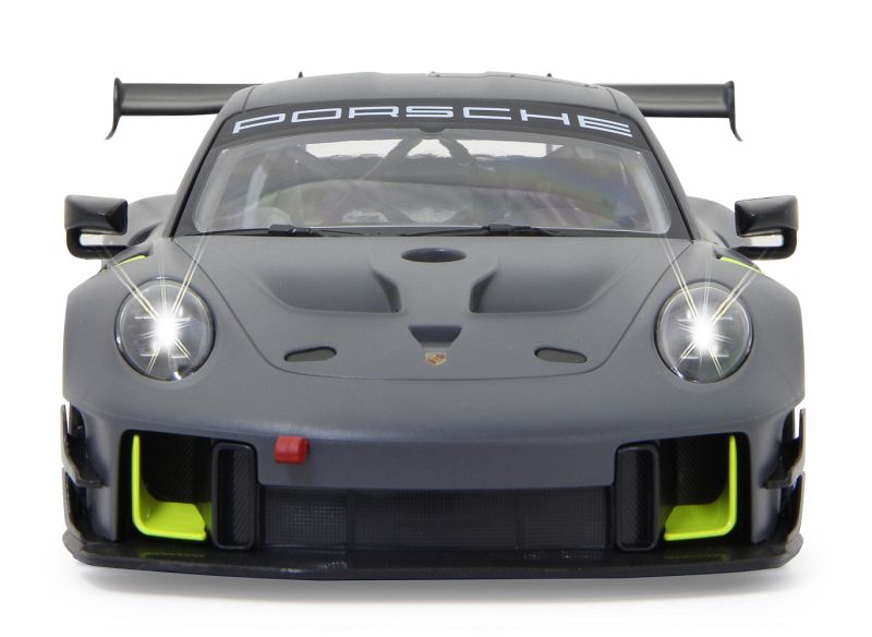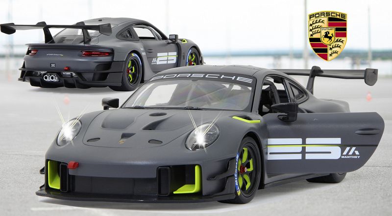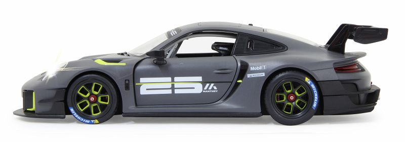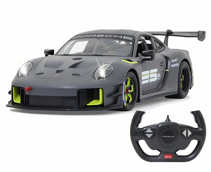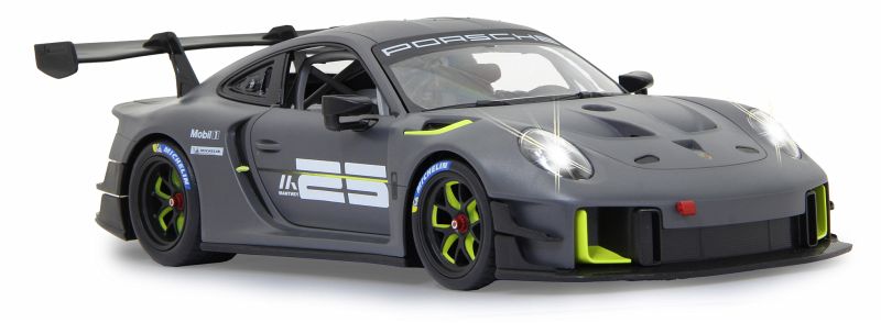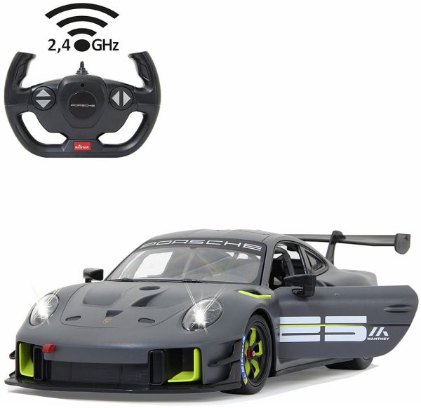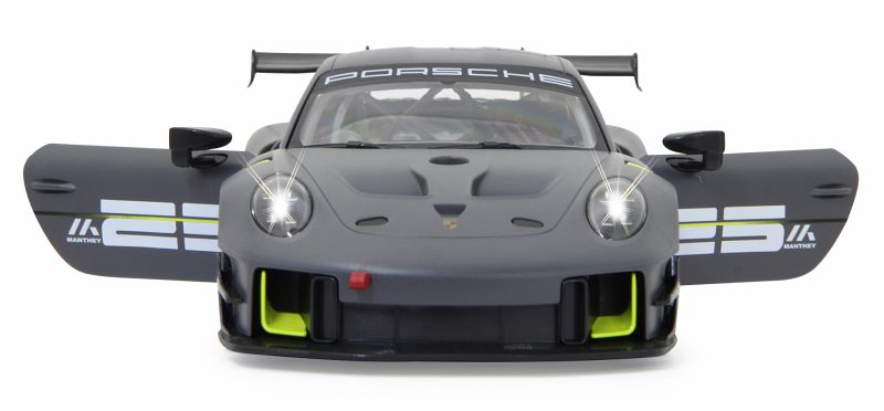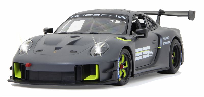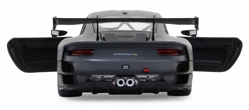 Der 911 GT2 RS Clubsport ist das stärkste GT-Kundensportfahrzeug, das Porsche bis dahin je gebaut hat ein höchstperformantes Turn-Key-Rennfahrzeug, geschaffen für Clubsportveranstaltungen auf Rennstrecken rund um den Globus. Im Original in einer exklusiven Limitierungsauflage von 200 Fahrzeugen. 700 PS bringt der stärkste 911er der Firmengeschichte mit seinem 3,8 Liter, 6-Zylinder Biturbo-Boxermotor auf die Straße. Der Traum so einen Wagen selber zu fahren kann jetzt wahr werden. Mit diesem offiziell lizensierten Deluxe Car Modell 1:14 von JAMARA können Sie sich das Gefühl so ein Sportwagen zu besitzen ins heimische Wohnzimmer holen. Mit LED Licht vorn und hinten, einem detailgetreuen Innenraum und perfekt nachgebildeten originalen Details an Chassis und Karosserie, die mit viel Liebe umgesetzt wurden, überzeugt das Fahrzeug auch durch die hochwertige Verarbeitung. Die Türen lassen sich von Hand öffnen und geben einen Einblick in den Innenraum des Porsche GT2 RS Clubsport. Mit der ergonomischen 2,4 GHz Fernsteuerung halten Sie, wie in einem echten Rennwagen, die Schaltzentrale in der Hand und erreichen Geschwindigkeiten bis zu 11 Km/h. Leicht zu erlernende Kommandos lassen das Modell genau das tun was Sie vorgeben. Also, ab zur Stadtrunde auf dem Parkett im Kinderzimmer und dem Spielspaß steht nichts mehr im Wege. Originalgetreue Lackierung Alle Deluxe Car Modelle von JAMARA sind Roboterlackiert. Dieses Verfahren ist einmalig bei den lizensierten Fahrzeugen. Statt einem einfachen eingefärbten Kunststoff kommen bei diesem Lackierverfahren Farben zum Einsatz die dem originalen Farbton des Fahrzeugherstellers nachempfunden wurden. Detailgetreuer Innenraum Bei den lizensierten Fahrzeugen im Maßstab 1:14 gibt es neben der originalgetreuen Fahrzeugbauform auch einen dem Original nachempfundenen Innenraum. Mit Lenkrad, Armaturenbrett, und Ausstattungsmerkmalen wie beim echten Automobil dieser Marke. Bis ins kleineste Detail wurde hier auf alles geachtet und umgesetzt. LED Fahrlicht Wie bei einem echten Fahrzeug in der Spezialausstattung gibt es bei diesem Modell ein Start-Stop LED Fahrlicht. Sobald das Modell losfährt leuchten die Scheinwerfer hell auf. Wenn das Auto stoppt gehen die LED Fahrlichter wieder aus. Diese Funktion spart Energie und erhöht die Fahrzeit des Modelles. Türen manuell öffnen/schließen Bei diesem Modell können die Türen auf beiden Seiten von Hand geöffnet werden. Einfach durch die Fensteröffnung greifen und schon kann man mit leichtem ziehen die Türen öffnen und genauso wieder geschlossen werden.