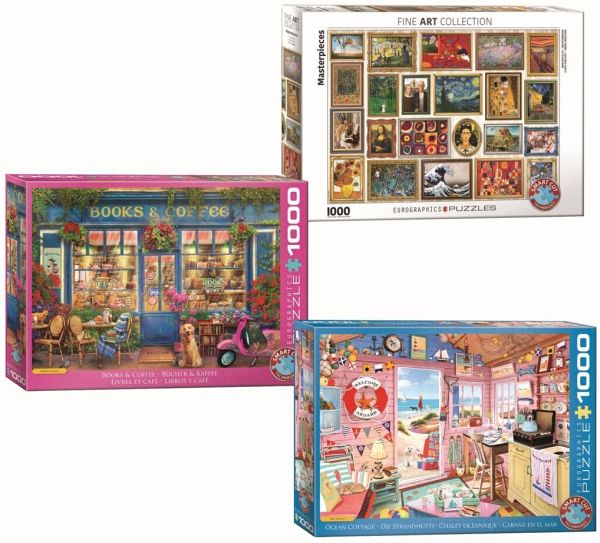 1. EuroGraphics Gemälde Collage 1000-teiliges Puzzle. Man kann wohl endlos diskutieren was zu den wichtigsten Gemälden der Kurlturgeschichte gehört. Viele glauben, dass Van Gogh, Monet und Klimt auf jeden Fall nicht fehlen dürfen. Welches wichtiges Werk vermisst Du? Kartongröße: 35 x 25 x 5,8 cm. Fertige Puzzle Größe: 48 x 68 cm. Hergestellt aus recyceltem Karton und bedruckt mit Tinte auf pflanzlicher Basis. Dieses hochwertige Puzzle wird alle gleichzeitig begeistern und neues entdecken lassen. 2. Dieses wunderschöne Puzzle ist das perfekte Geschenk für alle Buch- und Kaffeeliebhaber! Es zeigt ein gemütliches Café mit Bücherregalen, Leselampen und Tischen, an denen man ein gutes Buch bei einer Tasse Kaffee genießen kann. Das Puzzle ist aus hochwertigen Materialien gefertigt und wird Ihnen sicher jahrelang Freude bereiten. Außerdem ist es eine großartige Möglichkeit um dem Alltag zu entfliehen. Bücher und Kaffee sind zwei Dinge, die perfekt zusammenpassen. Sie sind beide ein Symbol für Entspannung, Genuss und Inspiration. Das Eurographics Bücher und Kaffee Puzzle fängt die Atmosphäre eines gemütlichen Cafés perfekt ein. Das Puzzle zeigt einen Blick auf ein Café mit Bücherregalen, Leselampen und Tischen, an denen man ein gutes Buch bei einer Tasse Kaffee genießen kann. Die Bücherregale sind mit Büchern aller Art gefüllt, und auf den Tischen liegen Bücher, Zeitschriften und Zeitungen. Im Hintergrund sind eine Kaffeetheke und eine Barista zu sehen, die Kaffee zubereitet. Das Bücher und Kaffee Puzzle ist eine Herausforderung, aber auch eine großartige Möglichkeit, sich zu entspannen und den Kopf frei zu bekommen. Während Sie die Puzzleteile zusammenfügen, können Sie sich in die faszinierende Welt der Bücher und des Kaffees entführen lassen und Ihre Sorgen vergessen. Es ist ein perfektes Geschenk für jeden Anlass, aber besonders für Buch- und Kaffeeliebhaber. Es ist ein Geschenk, das Jung und Alt gleichermaßen Freude bereiten wird. Und es ist ein Geschenk, das Sie immer wieder aufs Neue genießen können. 3. Entdecken Sie Ihr Traumstrandhaus mit diesem atemberaubenden 1000-Teile-Puzzle von Eurographics. Das Puzzle zeigt ein malerisches Strandhaus inmitten einer idyllischen Szenerie mit Dünen, Sandstrand und türkisfarbenem Meer. Das Puzzle ist aus hochwertigen Materialien gefertigt und wird Ihnen sicher jahrelang Freude bereiten. Die Smart-Cut-Technologie sorgt für eine präzise Passform der Puzzleteile und macht das Zusammenfügen des Puzzles zu einem besonderen Erlebnis. Bewundern Sie das detailgetreue Motiv des Strandhauses und der umliegenden Landschaft. Stellen Sie sich vor, Sie sitzen auf der Terrasse des Strandhauses und genießen den Blick auf das Meer. Spüren Sie den Sand zwischen den Zehen und den warmen Wind auf Ihrer Haut, während Sie die Puzzleteile zusammenfügen.