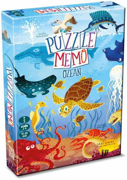 Puzzle-Memo OZEANDie Meeresbewohner im Riff des unendlichen Ozeans sind nur schemenhaft zu sehen. Lasst sie in ihrer ganzen Farbenpracht erstrahlen, indem ihr die verblüffenden Tiere findet und sie richtig auf dem Plan platziert.Doch halt - so einfach ist es nicht:Der Spielplan muss von unten nach oben belegt werden! Wer ein passendes Tierkärtchen legen oder vervollständigen kann, darf mit seinem Hütchen ziehen - und wer am Ende auf dem Strandpfad vorne liegt, gewinnt das Spiel!Mit Glück und Geschick kann man sich von anderen Spielern auch ein Stück mittragen lassen.+++ Starthilfe: jeder Spieler darf vor Spielbeginn ein beliebiges Kärtchen auf dem Plan platzieren +++ Neue Joker +++ Turbovariante +++ neue Farben für die Holzhütchen!
