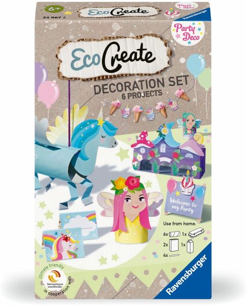 Im EcoCreate Set Decorate for your Unicorn Birthday von Ravensburger ist alles enthalten, um aus nicht mehr benötigtem Material (z.B. Eierkartons oder Toilettenpapierrollen) von zu Hause, tolle und einzigartige DIY Projekte zu basteln. Die gebastelten Upcycling-Objekte haben dabei einen Zweitnutzen und verschönern als farbenfrohe Dekoration jede Geburtstagsparty. Die einfach gehaltene Anleitung führt Schritt für Schritt durch jedes Projekt und garantiert ein schönes Endergebnis.