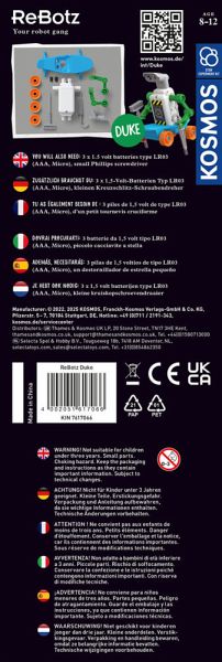Duke fährt mit Skateboard im Zick-Zack-Kurs - er ist der Skater aus der Reihe ReBotz, den verrückten Robotern vom Schrottplatz. Seine Einzelteile werden blitzschnell zusammengeklickt, der Motor mit Batterien in Gang gesetzt, und Besen und Regenschirm zum Abstoßen in die Hände gedrückt. Die ReBotz vom Schrottplatz tauschen untereinander die Bauteile, aus denen sie bestehen - dazu gehören natürlich auch schrottige Dinge wie alte Waffeleisen, Tennisschläger und Co. Die Anleitung liefert Ideen, wie die ReBotz-Bauteile kombinierbar sind und zeigt, wie mit kleinen Experimenten die Bewegung der Robos geändert werden kann. Der KOSMOS Experimentierkasten mit Duke gehört zu der Reihe ReBotz - diese Robo-Gang vom Schrottplatz mischt mit kuriosen Bewegungs-Kunststücken das Kinderzimmer auf. Aus der Bahn, hier kommt der coole Skater! Aus wenigen Einzelteilen und mit schnellen Klicks bauen Kinder ab 8 Jahren einen rollenden Roboter von KOSMOS zusammen. Schon düst er wild durchs Zimmer. Mit Schirm, Besen und Skateboard ausgestattet, ist bereits das Äußere des ReBotz etwas ganz Besonderes. Einfach der anschaulichen Anleitung folgen, Motor und Batterien einbauen und schon setzt sich der Roboter in Bewegung. Mit den variablen Armen wird jedes Mal neu bestimmt, wie Duke drauflos skatet. Die Robo-Gang wird durch Duke komplett! Er und seine drei Freunde beweisen, dass man auch mit alten Teilen vom Schrottplatz coole Tricks draufhaben kann. Wer gleich mehrere Roboter auf einmal gesammelt hat, kann alle ihre Körperteile wild miteinander kombinieren. Ein Riesen-Spaß!
